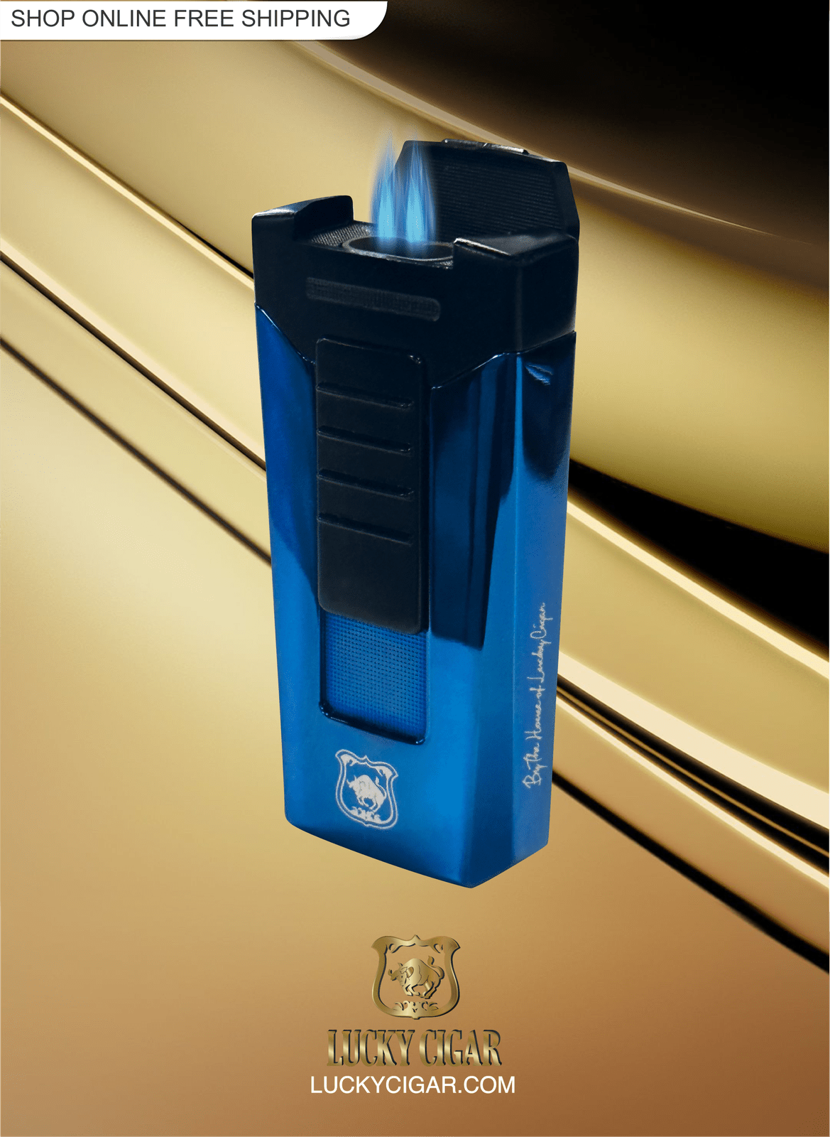 A sleek and powerful dual-flame torch lighter, designed for precision and reliability. Its wind-resistant flame ensures an even burn, making it a fantastic gift for cigar smoker who needs a dependable lighter on the go. The vibrant blue finish adds a stylish touch.