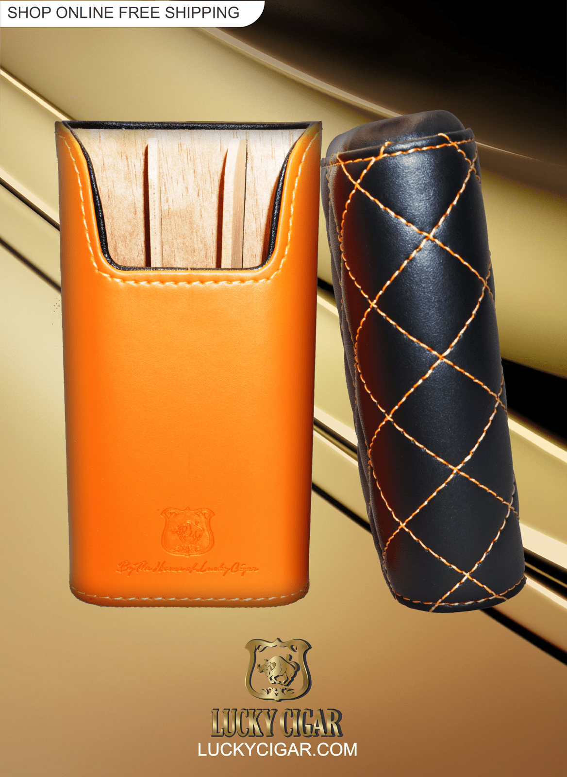 A stylish leather travel humidor with a vibrant black and orange finish, perfect for keeping cigars fresh on the go. With a soft interior lining and secure closure, it’s among the perfect gifts for cigar lovers who appreciate craftsmanship and protection in one.
