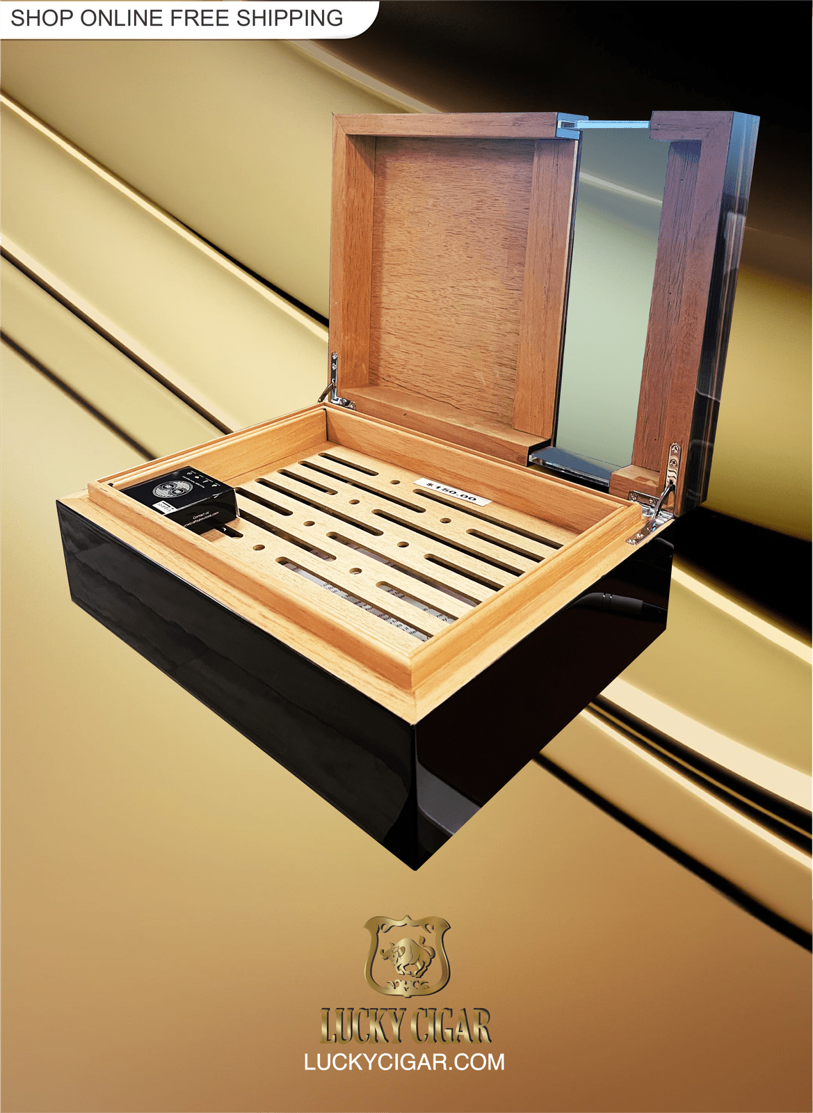 This spacious desk humidor can hold up to 50 cigars while adding a touch of class to any cigar collection, ensuring cigars stay at the perfect humidity level. The wood grain finish and glass window make it both practical and elegant.