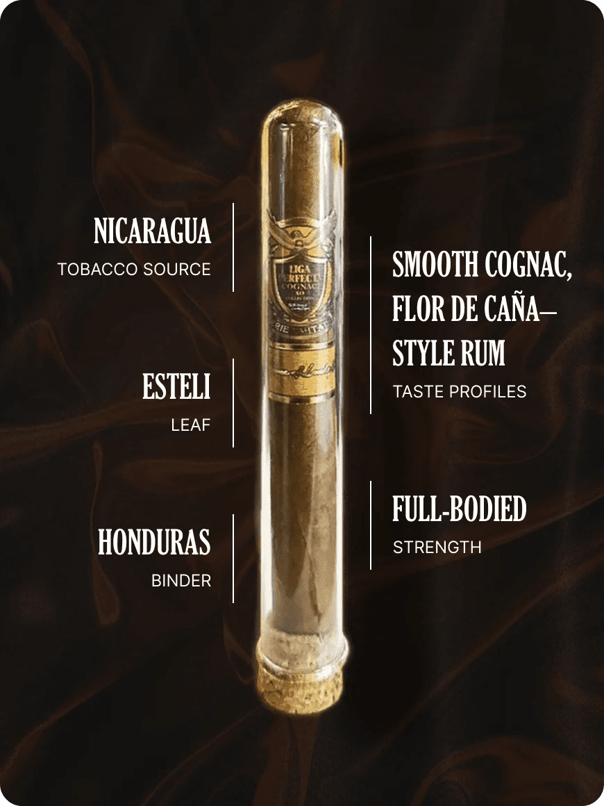 Presented in sleek glass tubes, these cigars come in convenient boxes of 10—ideal for personal enjoyment or sharing with fellow cigar lovers. Available in both Habano and Maduro wrappers, each Liga Perfecta COGNAC Toro is meticulously handmade in Nicaragua to guarantee exceptional quality and consistency in every draw.
