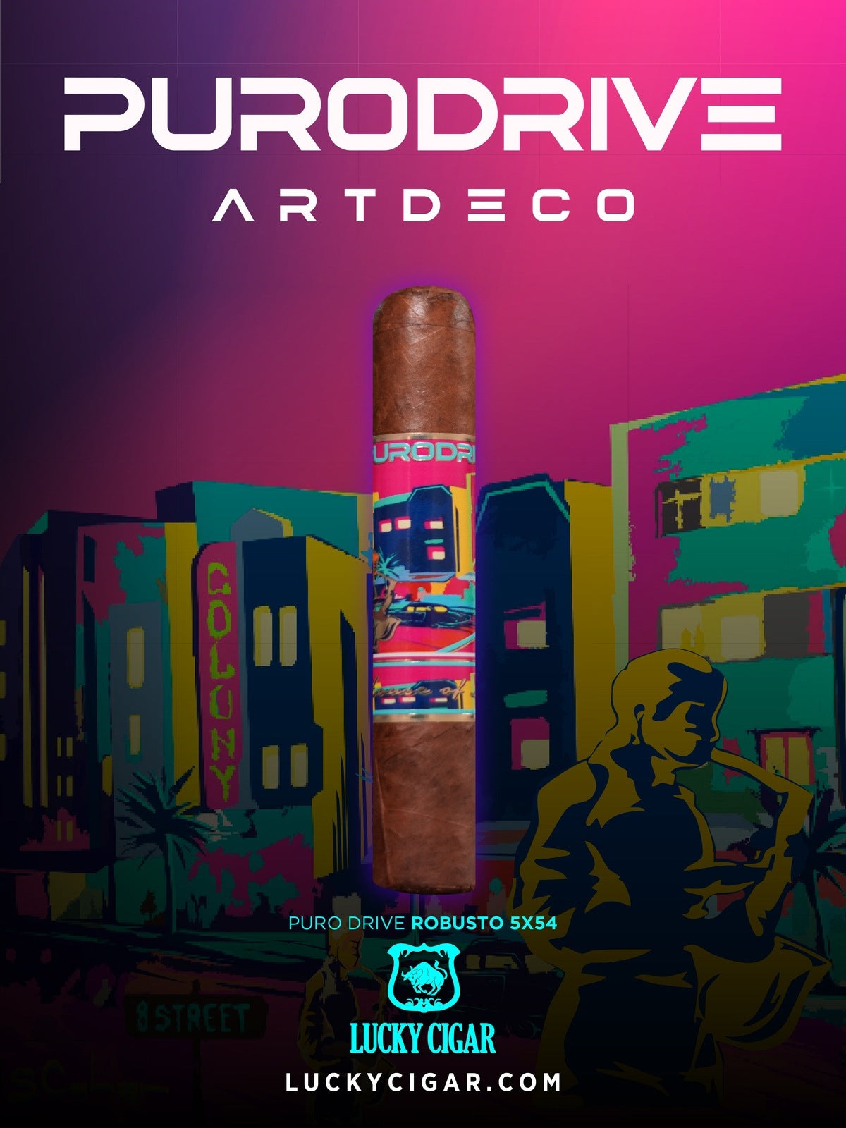 Introducing the Puro Drive Robusto 5 x 54, a bold infused cigar from Lucky Cigar’s Puro Drive Series. This cigar captures the energy of Miami’s Art Deco lifestyle through a combination of striking design and an unforgettable smoking profile. Perfect for aficionados who enjoy a robust format with modern infused flavor, the Puro Drive Robusto delivers quality and style in every draw.