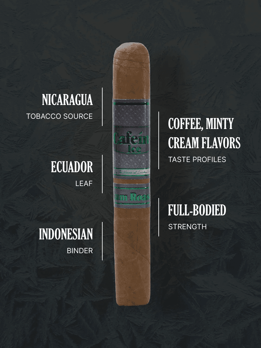 Handcrafted with precision, each cigar features a light Connecticut shade leaf wrapper, enveloping a rich mixture of premium long-leaf ligero tobaccos, sourced from various regions across Nicaragua. The infusion process combines mild to medium strength tobacco with a hint of coffee, complemented by a refreshing minty cream essence. This creates an aromatic smoke with a delightful cappuccino flavor.