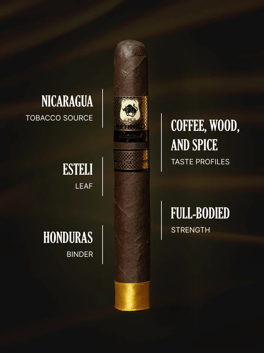 The Maduro Original collection is handcrafted in Nicaragua, featuring an Esteli wrapper, Honduran binder, and Nicaraguan filler for a truly robust experience.